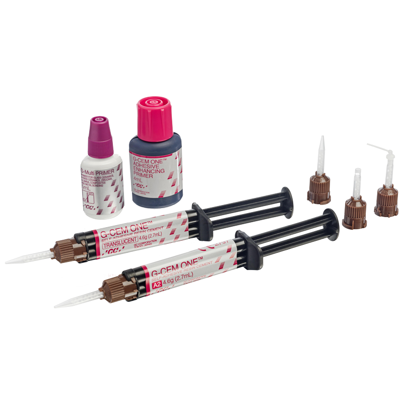 1 x G-CEM ONE Syringe A2 4,6 g + 1 x G-CEM ONE Syringe TR 4,6 g + 15 x GC Automix Tips Regular + 5 x GC Automix endo tips + 1 x G-CEM ONE Adhesive Enhancing Primer 4 ml